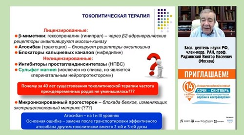 На инфосессии, прошедшей 28 апреля, были представлены доклады ведущих российских специалистов. Доклад по теме: «Преждевременные роды — нежелательный исход беременности. Как остановить? Атония матки: практические вопросы профилактики и ведения пациенток, врачебная тактика» зачитал заслуженный деятель науки РФ, член-корреспондент РАН, доктор медицинских наук, профессор, зав. кафедрой акушерства и гинекологии с курсом перинатологии Медицинского института Российского университета дружбы народов, вице-президент Российского общества акушеров-гинекологов, президент Междисциплинарной ассоциации специалистов репродуктивной медицины (МАРС) В.Е. Радзинский.