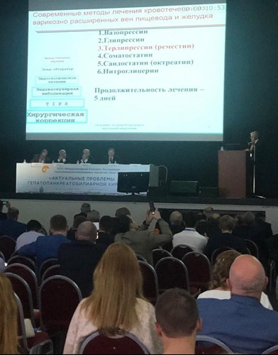 Е.А. Киценко, д.м.н., профессор, ведущий научный сотрудник отделения экстренной хирургии и портальной гипертензии ФБГНУ РНЦХ им. акад. Б.В. Петровского, представил доклад на тему: «Лечение и профилактика кровотечений из варикозных вен пищевода и желудка. Современное состояние проблемы (по материалам конференций Baveno VI, EASL, национальным клиническим рекомендациям)». В своем выступлении Евгений Александрович отметил актуальность и нарастающую распространенность такого жизнеугрожающего состояния как кровотечения из варикозно – расширенных вен пищевода и желудка, в терапии которой первое место занимает терлипрессин – препарат первой линии для пациентов с состоявшимися кровотечениями из варикозно расширенных вен пищевода, а также для минимизации интраоперационной кровопотери во время обширных хирургических вмешательств на органах брюшной полости.